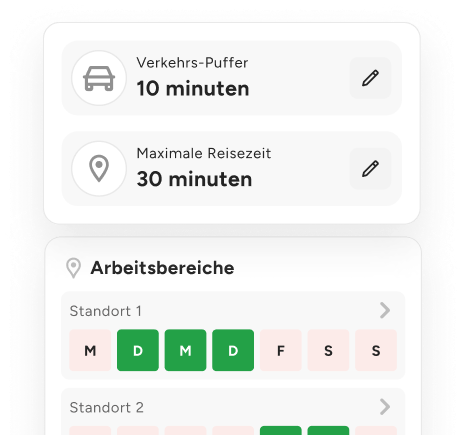 Lege Arbeitsbereiche für dich und deine Mitarbeiter fest und entspanne dich, während dein Buchungssystem sich um die Optimierung deiner Reisezeit kümmert.